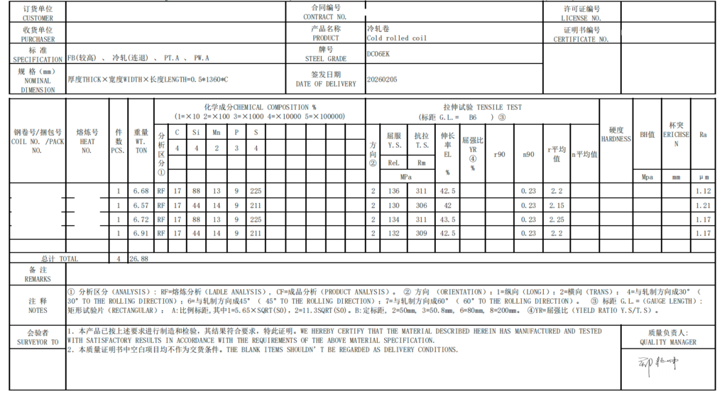 | DC06ED | Extra deep drawing | Excellent ductility | Complex forming |